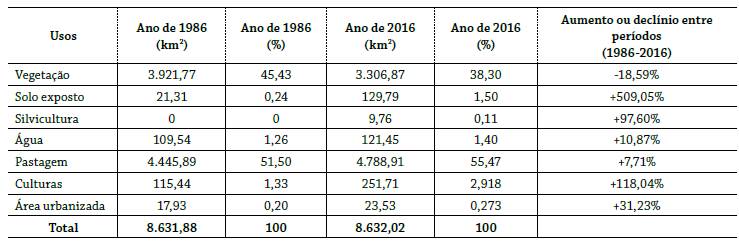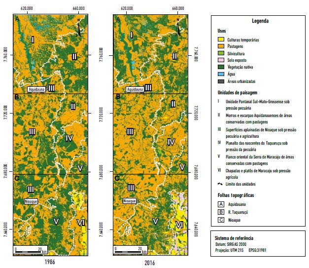 Considerando a apresentação da relação das estruturas das paisagens das seis unidades com os seus referidos usos da terra, é possível compreender que tais usos possuem relação direta com as limitações ou potencialidades apresentadas pela interação dos elementos físicos que formam tais conjuntos paisagísticos. Nesse sentido, apresenta-se, a seguir, a evolução/modificação e/ou manutenção dos usos da terra nessa área da Serra de Maracaju, tendo como referência o comparativo de 1986 e 2016.