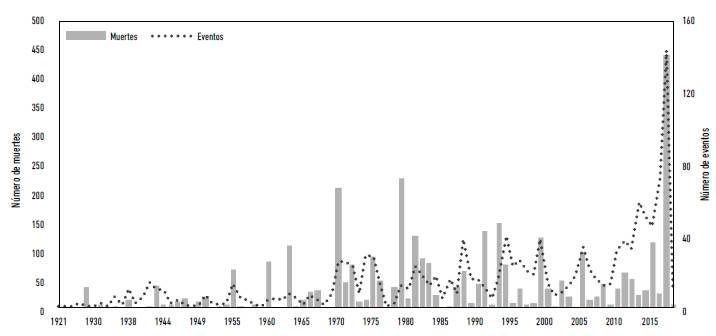 La Figura 1 presenta el registro de avenidas torrenciales entre 1920 y 2018 comparado con el número de muertes agregado a escala anual. Los datos señalan un aumento en el tiempo del número de personas muertas a causa de eventos de avenida torrencial en Colombia. Los valores máximos que sobresalen en la curva de muertes corresponden a eventos que tuvieron un gran impacto en términos de vidas humanas (Tabla 1). Los picos de ocurrencia (1988, 1994, 1999, 2005, 2011, 2013-2017) se correlacionan con episodios del fenómeno ENSO en su fase húmeda, La Niña, reportados por la Administración Atmosférica y del Océano (NOAA, por sus siglas en ingles) de los Estados Unidos (NOAA 2017).