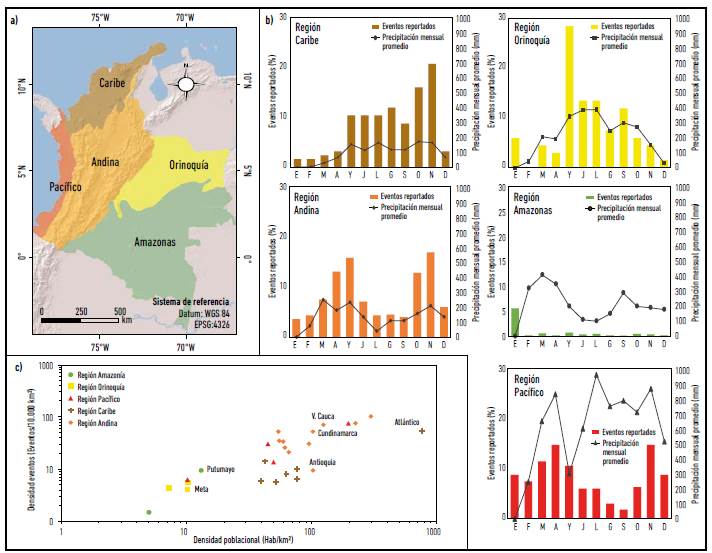 La Figura 2b presenta la distribución intranual de los eventos de avenida torrencial para cada región de Colombia con la precipitación media mensual, evidenciando la relación estrecha entre los regímenes de precipitación de cada región con la ocurrencia de eventos torrenciales.