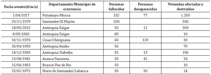 Las avenidas torrenciales son uno de los fenómenos amenazantes de origen natural de mayor capacidad destructiva como consecuencia de los reducidos tiempos de respuesta. Debido a sus condiciones geológicas, topográficas e hidrometeorológicas, Colombia ha sido golpeada por este tipo de eventos, con un registro de 1.358 avenidas torrenciales que han dejado un saldo de 3.318 muertos y más de un millón de habitantes afectados. La región Andina, como consecuencia de sus condiciones fisiográficas y poblacionales, presenta el mayor número de eventos, con el 59% de registros y el 55% de víctimas. La distribución temporal de la ocurrencia de avenidas torrenciales señala la estrecha relación de dichos fenómenos con las condiciones de lluvia de nuestras regiones y eventos ENSO es su fase La Niña.