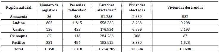 La Tabla 2 presenta el acumulado del número, fatalidades y personas afectadas, así como el número de viviendas afectadas y destruidas por fenómenos de avenida torrencial para cada una de las regiones de Colombia. Los datos señalan que la región Andina corresponde a la zona más afectada por este tipo de fenómenos, seguido por la región Pacífica y La Orinoquía.