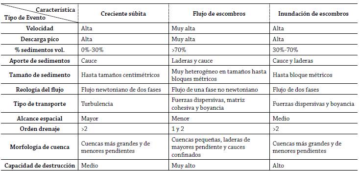La Tabla 3 presenta un análisis entre los diferentes flujos torrenciales que permiten clasificar las avenidas torrenciales. Debido al amplio rango de características que presentan dichos fenómenos y sus límites difíciles de establecer, se presentan en general las características comparativas entre ellos, y que, en alguna medida, aportan criterios para su identificación, resaltando que una sola avenida torrencial presenta generalmente diferentes tipos de flujos torrenciales, a lo largo de su desarrollo espacial en la cuenca, y la evolución temporal del flujo.