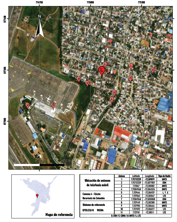 El 8 de enero de 2021, en la Comuna 6 de una ciudad del nororiente de Colombia, se instaló una antena de telefonía móvil 4.5G LTE Advance en las coordenadas de latitud y longitud 7,929210, -72,50511. Esta tecnología fue implementada sin el consentimiento y sin un proceso democrático y participativo adecuado de la comunidad. Además, la instalación no se llevó a cabo de manera transparente, ya que se realizó en horas de la madrugada, lo que generó preocupación y malestar en el vecindario. Los residentes creen que se trata de una torre 5G y se inicia un frente de movilización de oposición. A continuación, se presenta el área específica de estudio que comprende la localización geográfica de la antena en conflicto (Figura 1), asociada a la distribución espacial de antenas adyacentes que ya estaban instaladas. Hay un total de diez antenas en el área, la más cercana a 46 metros de distancia y la más distante a no más de 550 metros.