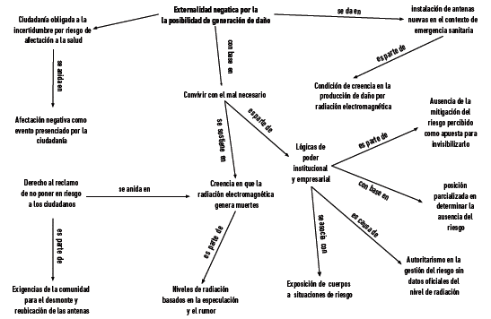 El que residentes se hayan cuestionado sobre el riesgo tecnológico por contaminación electromagnética partió de la base elemental de admitir su existencia. La manera con la que se vio ese fenómeno de contaminación por parte de la comunidad en la ciudad estudiada nos acercó a la categoría central de externalidad negativa por la posibilidad de generación de daño (Figura 2). Lo disputado fue la aceptación ciudadana de haber instalado antenas nuevas en zonas residenciales. Se dialogó con residentes que se sintieron afectados y aquellos que consideraron que podrían ser víctimas.