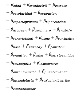 Para el desarrollo del modelo se tomaron datos abiertos de la Secretaría Distrital de la Mujer de Bogotá (2020b), la cual cuenta con bases de datos para cada servicio que brinda a las mujeres de la capital y alrededores, en casos reportados a través de la Línea Púrpura, que es un canal de denuncia de violencia. Los datos seleccionados se filtraron por fechas para un rango de tiempo entre el 24 de marzo y el 31 de agosto de 2020, marco del confinamiento decretado en Colombia. Así, se obtuvieron 4.033 reportes de denuncias, con los cuales se organizó una base de datos (Secretaría Distrital de la Mujer 2020b) a partir de información de mujeres víctimas de violencia. Esta se discriminó por localidades de Bogotá, tomando en consideración la edad de la persona, el estado civil, el estrato, la ocupación, el lugar en el que se encontraba cuando fue violentada (espacio público o privado) y la relación con su agresor(a), entre otras. Una vez obtenida la base de datos, se hicieron los respectivos cambios en las variables, para su posterior procesamiento. Debido a la naturaleza de los datos, se optó por estimar un modelo de regresión de variable cualitativa, cuyas variables explicativas se muestran en la Ecuación 1.