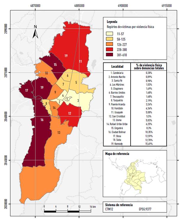 En la Figura 2, el mapa de la distribución de víctimas de violencia física contra la mujer por localidades en Bogotá indica que la mayor parte de la ciudad tiene un alto registro de casos, solo para la época de confinamiento, y se destacan localidades como Bosa, Ciudad Bolívar, Engativá y Kennedy. En adición, la figura incluye una tabla porcentual que relaciona el número de denuncias por violencia física con el total de denuncias que realizaron las mujeres de la capital para el mismo periodo de cuarentena en el 2020.