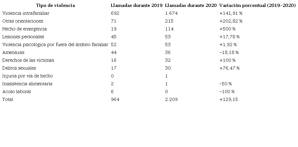 Se observan los cambios porcentuales de los tipos de violencia denunciados en dos periodos de tiempo comparables por año, con aumentos considerables para el 2020, justamente en el periodo objeto de análisis del presente artículo.