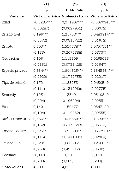 Se finaliza el ejercicio empírico con el cálculo de los cambios marginales de la probabilidad, en la última columna de la tabla (dy/dx), que expresa la probabilidad de que el fenómeno se cumpla (que la víctima sí fue víctima de violencia física), lo cual facilita su interpretación final, al poder expresar el aumento o la diminución en la probabilidad ante cambios en las variables dependientes.