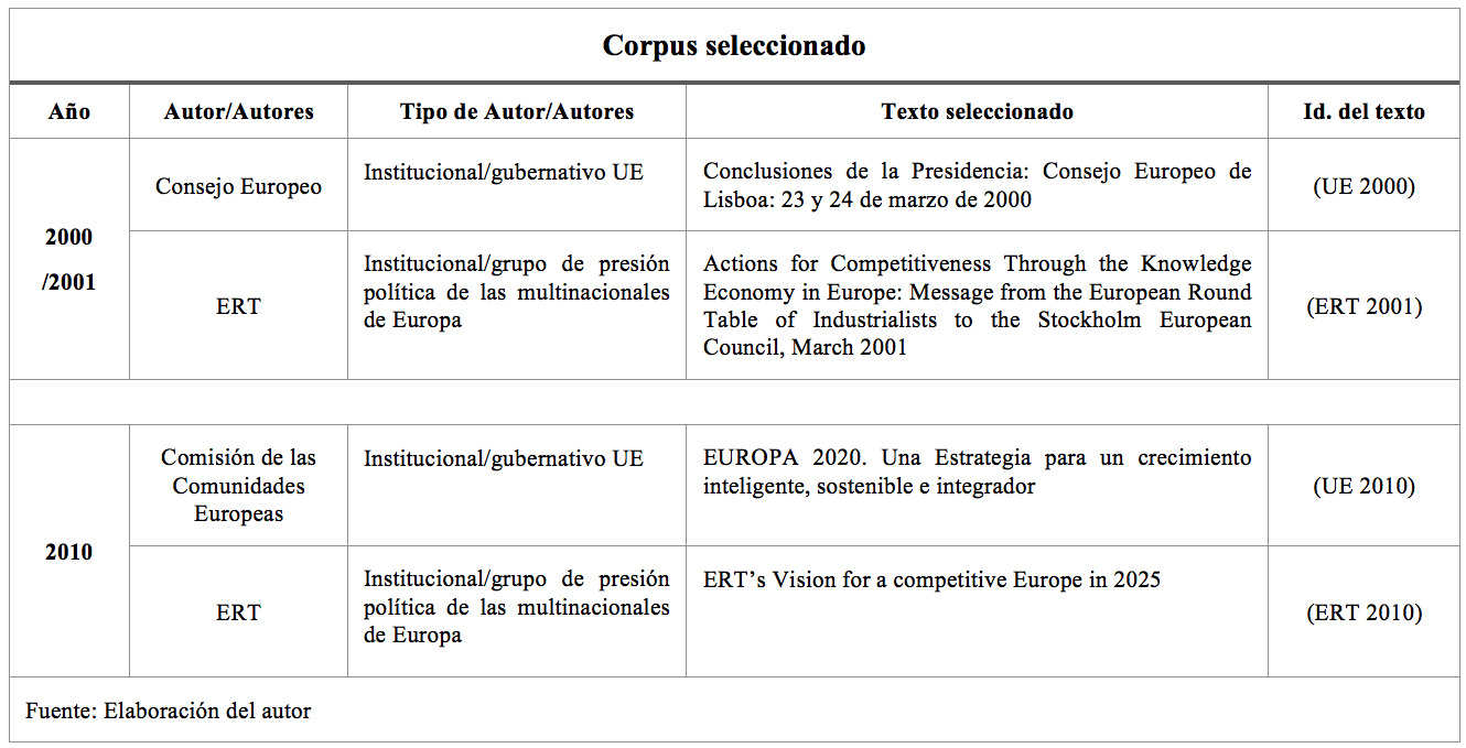 Los discursos de European Round Table9 y de la Comisión y Consejo de la UE, son representaciones particulares, partes del nivel coyuntural de las prácticas sociales, mientras que los textos escogidos se localizan como momentos significativos respecto al objetivo de analizar el proceso de producción ideológica de la gobernanza europea. Hemos seleccionado la muestra en base a periodos diferentes y definidos (textos producidos en años similares), a las temáticas tratadas (las políticas desde la Sociedad de la Información/ Conocimiento, ICT, educación y empleo), y a la importancia coyuntural (política, social y relacional) en el estado de correlación de fuerzas de la presente década. Con estos criterios, hemos elegido cuatro informes (dos producidos por ERT y dos producidos por la Comisión Europea) de importancia estratégica en cuanto marcan la puesta en marcha de planes de ajustes estructurales decenales con el objetivo de desarrollar la economía del conocimiento en la UE.