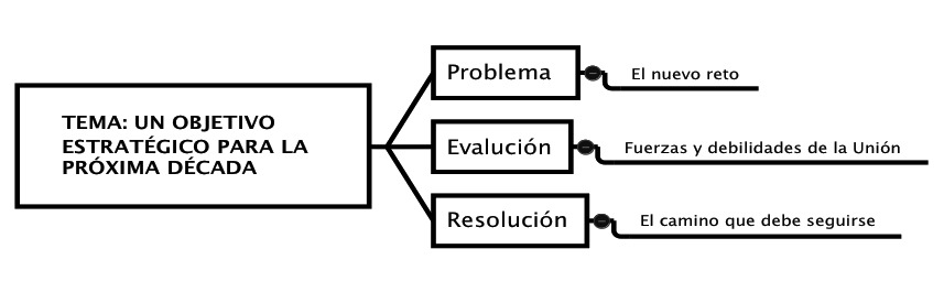 Se marca así un evento concreto: se construye el agente de forma incluyente y consensual (los europeos), actuando en un proceso existencial (están en el proceso de construir), y por tanto indiscutible, para conseguir una meta (nueva Europa) con unos medios coercitivos (sobre las bases de una mejor competitividad y una economía dinámica basada en el conocimiento).