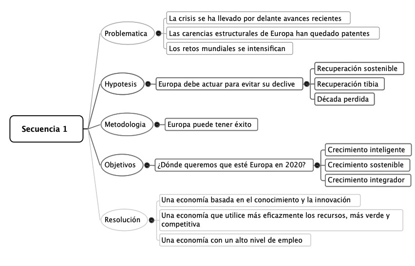 En este cuadro la Comisión se encuentra accountable no sólo respecto a los gobiernos nacionales (poliárquica), sino también respecto a la opinión pública. La estructura genérica de Europa 2020 se construye a sí misma con base en estas cuestiones: una cadena continua de géneros que alternan el texto argumentativo, el expositivo y el instructivo en un ejercicio continuo de intergenericidad. A nivel macroestructural podemos identificar dos líneas argumentativas principales: una que desarrolla la temática Europa 2020 como estrategia de crecimiento heredera de Lisboa 2000 (Secuencia 1) y otra que desarrolla la temática Europa 2020 como “estrategia creíble de salida de la crisis” (Secuencia 2). La Secuencia 1 delimita nuestra muestra: está compuesta también por una secuencia expositiva similar al genero de ensayo científico.