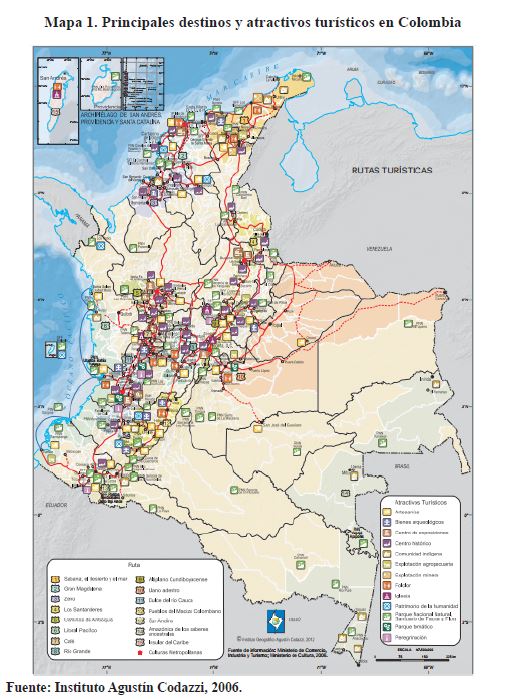 Dentro de este panorama general, en Colombia, el turismo ha pasado de tener una posición secundaria a ser una actividad creciente, especialmente, durante los últimos 15 años. No obstante, el sector siempre ha tenido una posición marginal en el país, con una reducida participación porcentual en el producto interno bruto, que, en los últimos 30 años, siempre se ha situado entre el 2% y el 5% del valor total (Brida et. al., 2011: 292). Ello debido a múltiples factores, como la existencia de un énfasis productivo que ha caracterizado la estructura económica nacional, centrado en los sectores agrícolas, manufactureros, extractivistas y de hidrocarburos, y también comerciales, aunque, fundamentalmente, de tipo financiero. Los primeros han supuesto, además, un inconveniente añadido al desarrollo de algunos destinos colombianos, al competir directamente en el uso intensivo de los recursos naturales. De otra parte, la inexistencia, durante mucho tiempo, de un modelo turístico integrado para el país, ha conllevado a que, a pesar de los esfuerzos gremiales e institucionales, la actividad turística haya sido vista más como un “bonito adorno” que como un sector estratégico para el desarrollo regional y nacional del país (Gómez, 2002: 63).