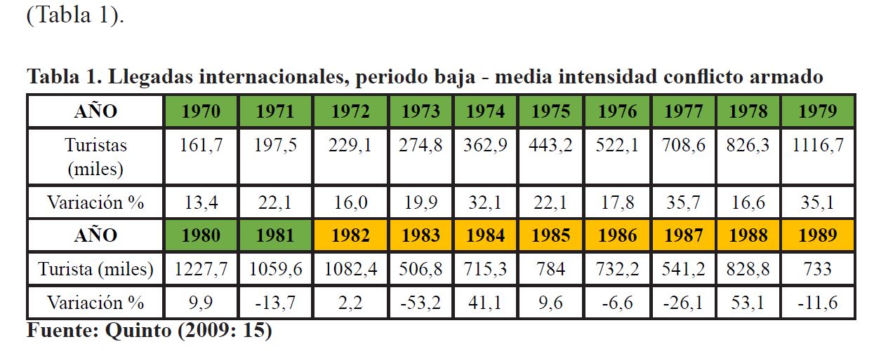 La situación cambia durante los años 80 aunque, según Jaramillo (2006: 8), el impulso turístico del país se ve frenado, en un primer momento, por la mala gestión, el narcotráfico y la corrupción, ya que el conflicto armado no era tan determinante, y por tanto la intensidad del mismo podía considerarse baja o media, si bien ya empezaba a condicionar algunas prácticas turísticas nacionales e internacionales, y la seguridad, a finales de la década, ya empezaba a percibirse como un impedimento para la realización de viajes por el país (Bassols, 2016: 318). De hecho, atendiendo a la anterior tabla, el número de turistas se redujo de manera considerable, con un descenso acusado entre los años 1983 y 1987, y, para finales de la década, cuando la afluencia se había reducido casi a la mitad. A nivel institucional, la labor de la Corporación Nacional de Turismo prosiguió, realizando campañas de concientización como “turista satisfechos trae más turistas”, que ahondaban en la necesidad de trasmitir una visión amable por parte de la población receptora. De igual manera, en el año 1984, se crean los fondos mixtos de promoción turística, como acción para el fomento de la inversión en el sector, y que, posteriormente, serían integrados bajo el Fondo de Promoción Turística - FONTUR.
