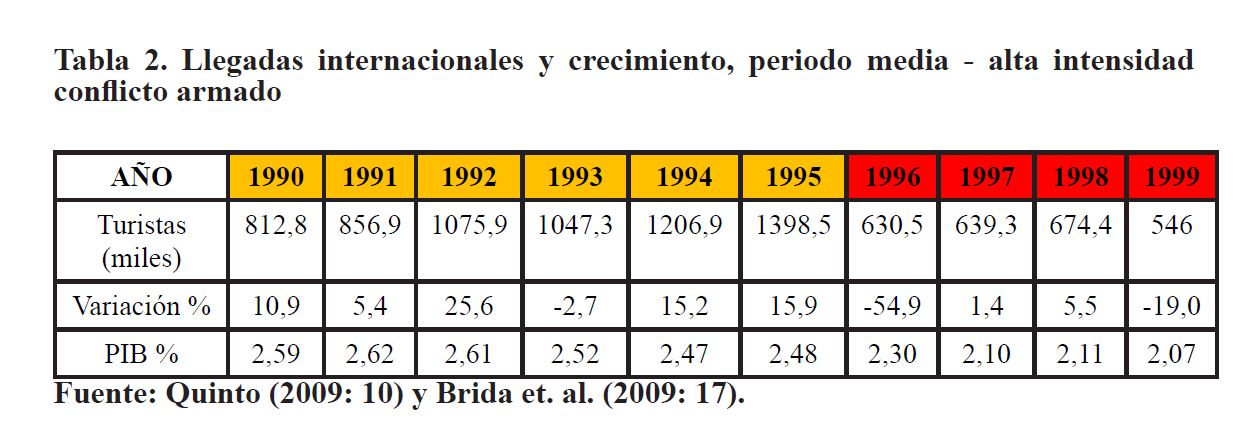Al mismo tiempo, el turismo se ha visto reducido y limitado por el conflicto armado, desde los años 80, y principalmente, durante toda la década de los 90 (Gómez, 2002: 57; Van Broeck, 2002: 44). La inestabilidad política de este periodo ha condicionado tanto el desarrollo de los destinos turísticos más maduros como aquellos emergentes del país, así como los flujos turísticos emisores y receptivos, tanto domésticos realizados por los colombianos al interior del país