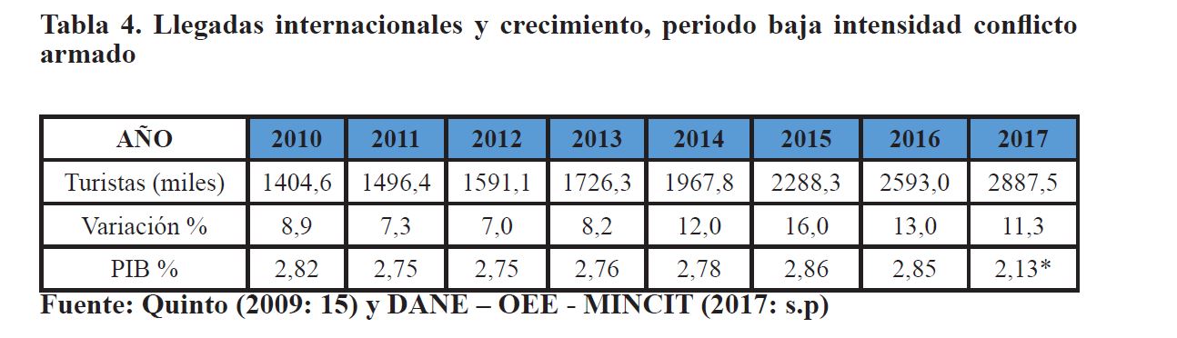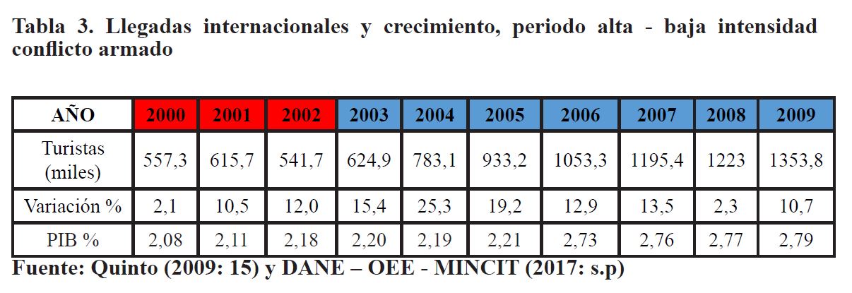 No obstante, estos indicadores turísticos aún no permitían ubica a Colombia como un destino americano representativo (Brida et. al, 2009: 18) pero si como un importante factor de cambio en el país, que, conforme a la posible finalización del conflicto armado, auguraba la mejora de los niveles de seguridad, accesibilidad e imagen internacional; crecimiento económico derivado del efecto multiplicador del turismo, y cada vez más, ser un vector de desarrollo que pueda generar territorios de paz (Gómez, 2002: 65; MINCIT: 2014: 6).