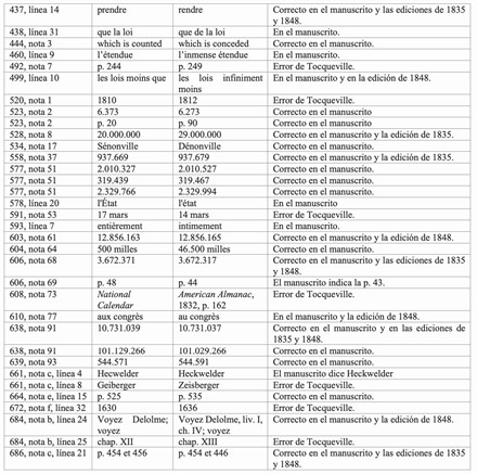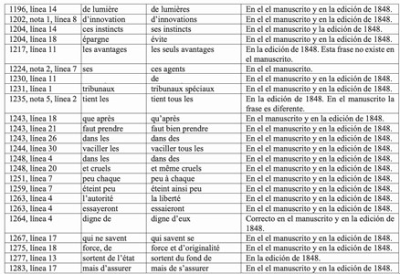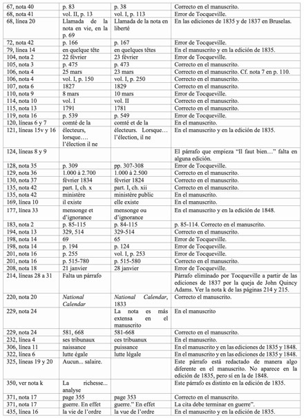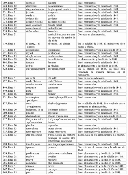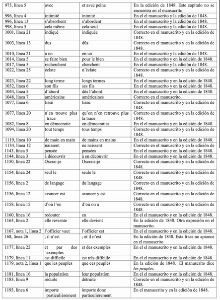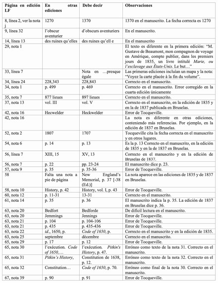 Con el fin de resolver las dudas sobre los textos y de ayudar a resolver algunas de las incongruencias que los estudiosos han hallado en la obra, se presentan a continuación unas tablas con los errores de distinto tipo que como editor he hallado al cotejar las ediciones citadas con los manuscritos de Tocqueville.
