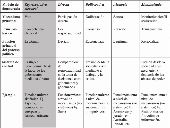 Son numerosas las propuestas de revitalización de la democracia existentes. Aquí nos circunscribiremos a aquellas que han generado un amplio debate en la teoría y la ciencia política contemporánea y que han dado lugar a iniciativas concretas, de mayor o menor calado. Introducimos cinco: democracia representativa, democracia participativa, democracia deliberativa, democracia aleatoria y democracia monitorizada. No se trata –no sería posible– de profundizar en todos sus aspectos sino de observar qué incentivos generan sus mecanismos.