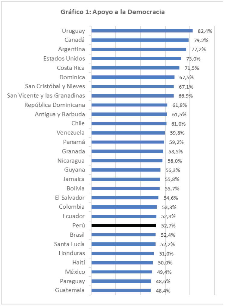 En el Perú, al igual que otros países de la región, el descontento con instituciones como los partidos políticos y la democracia ha crecido con el paso del tiempo. En el último estudio realizado por el Latin American Public Opinion Project (LAPOP) se evidencia la desafección de los ciudadanos peruanos para con el sistema democrático. Es así como solo el 52.7% de estos apoya a la democracia como la mejor forma de gobierno constituyendo al Perú como uno de los ocho países con menor apoyo a la democracia en América Latina. Esta desafección se ha mantenido a través del tiempo pues el porcentaje de ciudadanos que apoya al sistema democrático no ha pasado del 65% desde los estudios realizados a partir del 20064 (Carrión y Zárate 2018). Esta desazón con el sistema democrático ha tenido como consecuencia, en los casos más extremos, el rechazo al proceso electoral mediante el uso de la violencia política y el potencial apoyo a opciones no democráticas a cambio de seguridad o garantía de menor corrupción estatal.