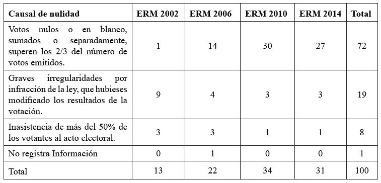 Del total de los distritos en donde se declaró la nulidad, el 95% presentaba hechos violentos durante el proceso electoral, es decir, que si bien la causa legal en la mayoría de casos se asoció al ausentismo o abstencionismo electoral esta no toma en consideración los distintos procesos sociales violentos y los contextos políticos de cada caso. De esta manera, la violencia electoral como tópico de estudio ha sido, en ocasiones, invisibilizado ante la falta de reconocimiento legal de este fenómeno.