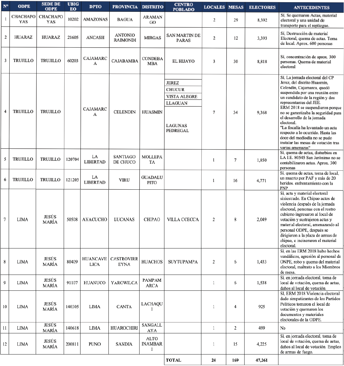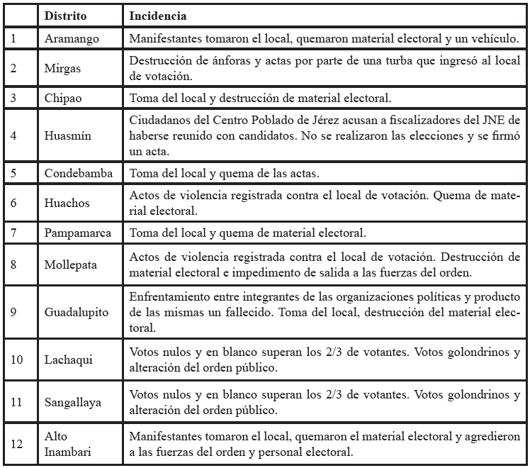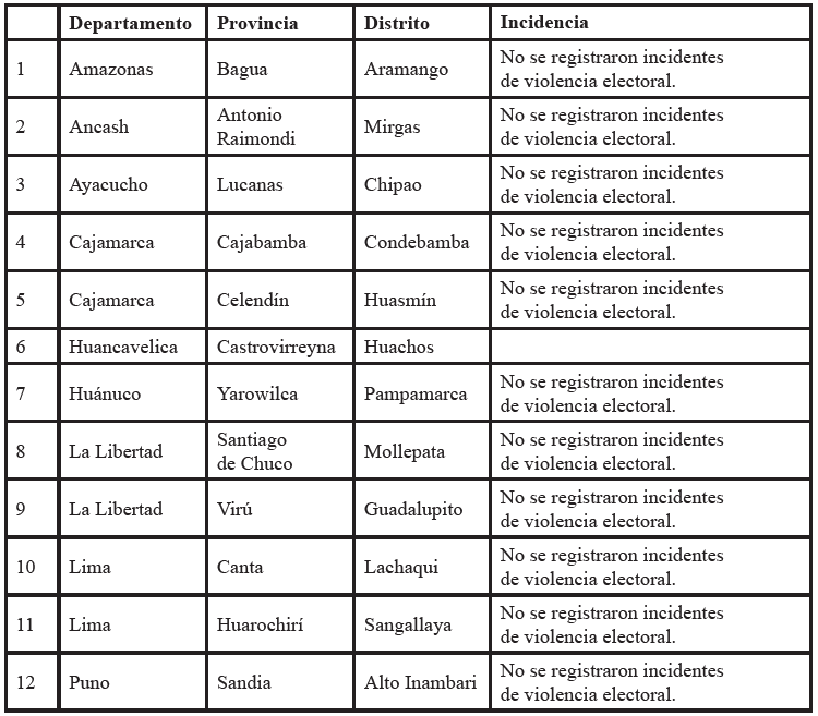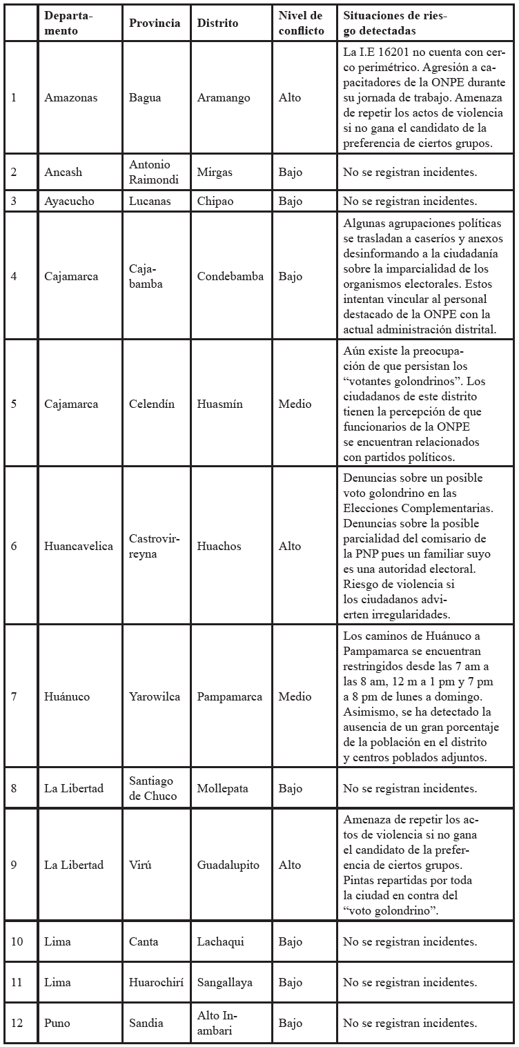 Por otra parte, era necesario tener en cuenta a tres distritos con un alto nivel de conflicto registrado. Estos fueron: Aramango (Amazonas), Huachos (Huacavelica) y Guadalupito (La Libertad). En todos los casos, grupos pertenecientes a partidos políticos y otras asociaciones amenazaron al personal de la ONPE de repetir los actos de violencia si es que el resultado electoral no era favorable para algunos sectores o si se detectaba alguna irregularidad. El peligro de que eventos de violencia persistan se encontraba presente.