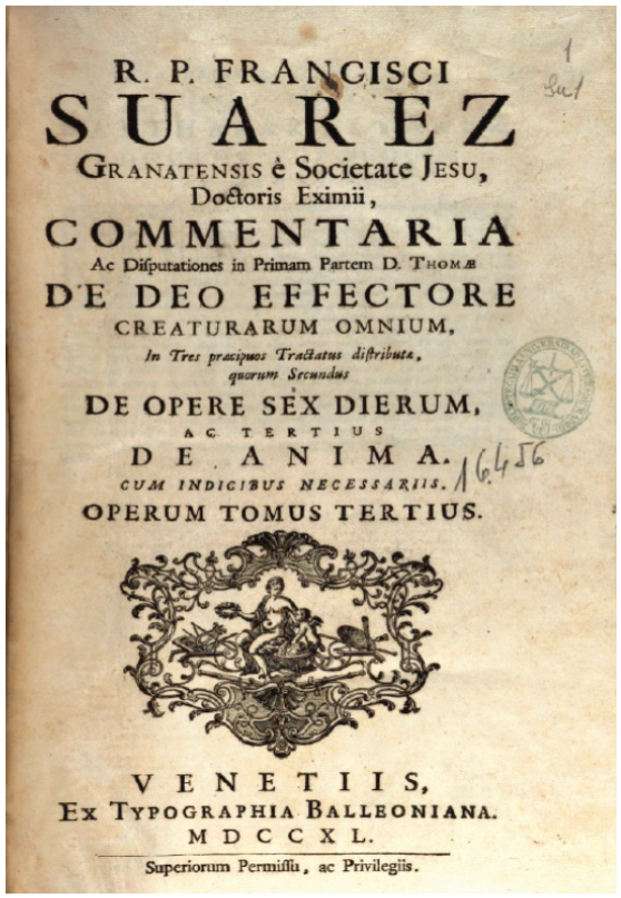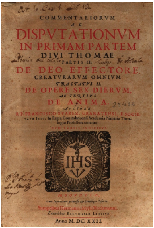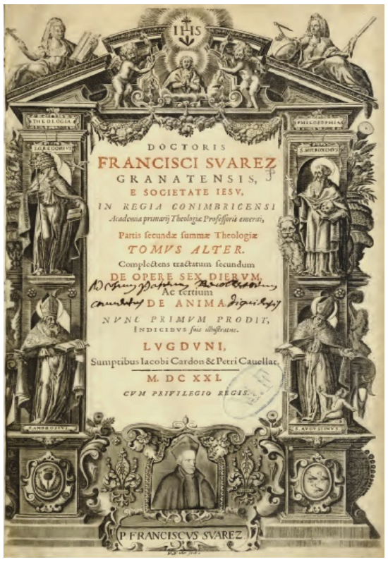 A la muerte de Suárez (1617) algunos de sus escritos permanecían aún inéditos. De ellos se hablaba ya en las primeras cartas que comunicaban su fallecimiento. Así, el P. Núñez Mascarenhas, superior de la casa de Lisboa donde falleció el insigne teólogo, decía al provincial de la Compañía de Jesús en el reino de Aragón: “El P. Suárez se había recogido en el Noviciado para preparar la impresión de varios volúmenes: primero, el De Angelis; segundo, el De opere sex dierum [en adelante, DOSD]; tercero, De fide; cuarto y quinto, De gratia . De auxiliis; sexto y séptimo, De statu religionis; octavo, De voluntario et involuntario”3. Unos días después, el rector del colegio de Coimbra en el que Suárez vivió desde su llegada a Portugal, Antonio de Abreu, se dirigía a Vitelleschi, general de los jesuitas de entonces, con las siguientes palabras: “Fuera de los trece volúmenes que tiene publicados, compuso el P. Suárez otros siete u ocho. Y no dudo que el P. Provincial o el que le suceda, tomará a pecho su impresión. Empero, esas obras han de ser tan útiles a la Compañía […] que me atrevo a suplicar a V. paternidad recomiende con mucha instancia dichas publicaciones al P. Provincial y al rector que va a reemplazarme en este colegio, pues aquí es efectivamente donde están los papeles del difunto”4. Siguiendo este parecer, Vitelleschi decidió que el trabajo de edición e impresión de aquellas obras inéditas fuera realizado en Coimbra por Balthasar Álvarez. Balthasar Álvarez (1561-1630) era un jesuita, profesor de filosofía y teología en la Universidad de Évora, de la que llegó a ser rector. La razón de su elección como editor de los escritos póstumos de Suárez parece haber sido, más que su trayectoria académica, el vínculo personal de una larga amistad con Suárez5.