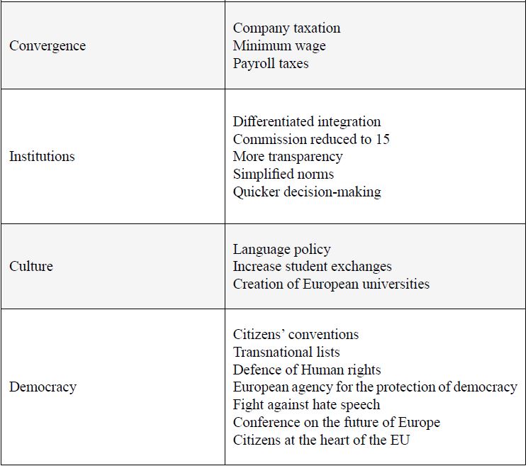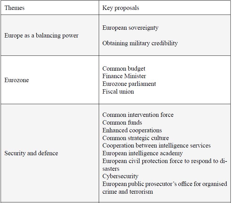 After a decade when Member States were trapped in everyday crisis management, Macron has offered an impassioned plea for the EU, articulating a positive framing of the European project and radically breaking away from his predecessor’s polite indifference towards the EU (Chopin 2018). The scope of his proposals is undeniably ambitious, as summarised in the table below.