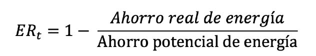 Formalmente el efecto rebote generado por el progreso tecnológico en un periodo t puede ser definido como uno menos el cociente entre el ahorro real de energía después de la introducción de la medida de mejora tecnológica y el ahorro potencial de energía que podría alcanzarse de no existir efecto rebote y que se deriva de cálculos estrictamente ingenieriles (Arocena et al.; 2016). En definitiva,