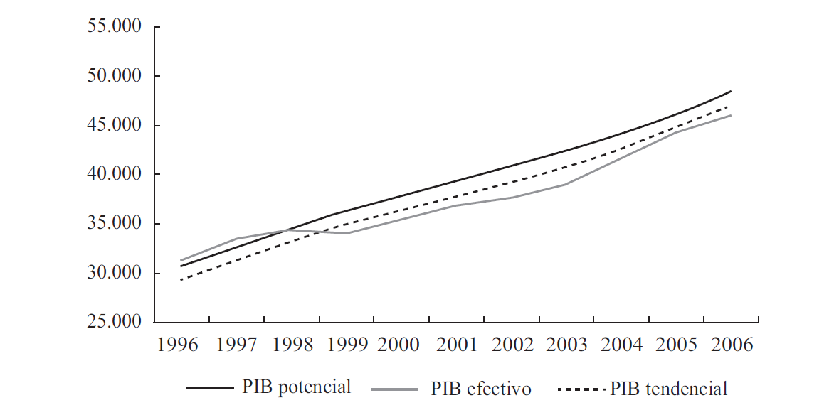 Ahora bien, si durante un período relativamente prolongado la economía cae por debajo de la tendencia estimada (como en todo el quinquenio 1999-2003)14, el ritmo de crecimiento tenderá a debilitarse todavía más, dando origen a una reducción espuria de la brecha productiva (por efecto “disminución de la altura de la vara”) y, por ende, debilita al conjunto de las políticas contracíclicas. Así pues, cuando las políticas monetaria y fiscal se supeditan a la trayectoria del PIBt, en lugar del PIB*, el resultado es una “profecía autocumplida” que suele deprimir la futura frontera productiva. La Gráfica 1 muestra una estimación del PIB* y del PIBt para el período 1996-2006, con equilibrio macroeconómico entre demanda agregada y PIB* entre 1996 y 1998 y brecha recesiva entre 1999 y 2006.