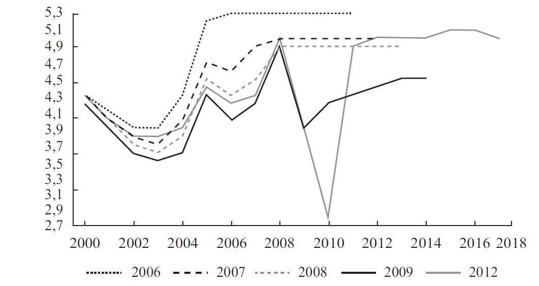 En nuestra opinión, ello comprueba que la metodología en boga suele tener un sesgo procíclico. Dada la asimetría entre la magnitud limitada en que el PIB efectivo puede exceder el PIB* y la elevada magnitud en que puede situarse por abajo, el sesgo del PIB tendencial tiende a ser depresor del crecimiento potencial. Por el contrario, las proyecciones para los cinco años siguientes, que efectúan los miembros del comité de PIBt en cada reunión anual, cuando esta se realiza en coyunturas de auge, como en 2010-12, tienden a ser sobreoptimistas del crecimiento futuro, lo que ha más que compensado aquella causa de subestimación del PIB*. Ello ha implicado que, después del peak de 2007, entre 2010 y 2013, el crecimiento acumulado del PIB efectivo haya sido 7,6 puntos inferior a la estimación de aumento del PIBt (véanse Cuadro 2, comparar líneas 1 y 2)15.