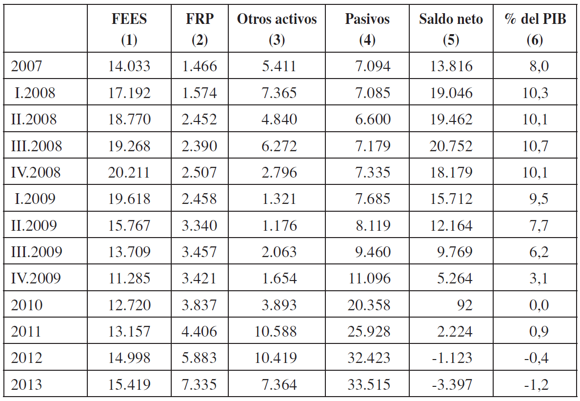 Desde 2004, la persistencia del auge de los precios de las materias primas permitió varios años de cuantioso ahorro fiscal, hasta el punto de que el Ministerio de Hacienda pasó a constituirse en acreedor neto del mundo, con saldos crecientes en sus fondos de estabilización. Hacia el 2008, el Fondo de Estabilización Económica y Social (FEES, sucesor del Fondo de Estabilización de los Ingresos del Cobre, FEC), y el Fondo de Reserva de Pensiones (FRP) habían acumulado el equivalente al 13 % del PIB, en tanto que sustanciales amortizaciones de los pasivos fiscales los habían llevado a un monto ínfimo, gracias a las elevadas amortizaciones efectuadas con cargo a los excedentes fiscales registrados en esos años. El Cuadro 1 muestra la acumulación de los dos fondos establecidos en 2006, el FEES y el FRP y el reducido nivel de pasivos del gobierno central hacia el 2008. Su posición financiera era de acreedor neto en la suma de monedas extranjera y nacional.