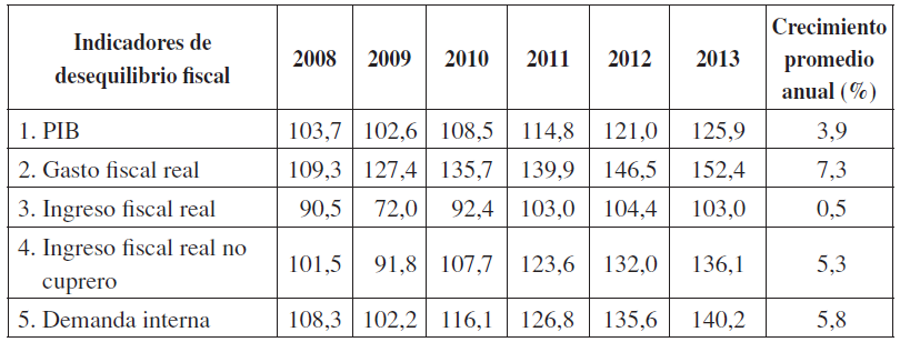 Los desequilibrios los ilustra el Cuadro 3. Tomamos como año base el 2007, antes de los efectos distorsionadores del contagio de la crisis global. En el sexenio 2008-2013, el PIB se elevó 26 %, un 3,9 % anual (fila 1), en contraste con el 52 % de incremento del gasto fiscal, un 7,3 % anual (fila 2)20. El ingreso fiscal no cuprero creció 36 %, más que el PIB, gracias a que el gasto interno se elevó más que el PIB merced a que la recaudación del IVA (en términos simples, un impuesto al gasto) se beneficiaba del exceso del gasto por sobre la producción21.