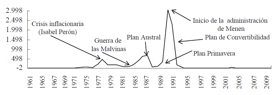 Al respecto, la hiperinflación fue recurrente en Argentina durante el período 1975-1991 (Gráfica 1). Por ejemplo, durante la administración de Alfonsín (1983-1989), que marcó el regreso a la democracia, las demandas sociales y el incremento del servicio por concepto de la deuda externa1 generaron la necesidad de aumentar los ingresos públicos; la solución provisional fue la emisión monetaria (en 1984 la inflación fue de 626% y en 1985 de 672%), lo que finalmente afectó la recaudación (efecto Olivera-Tanzi).