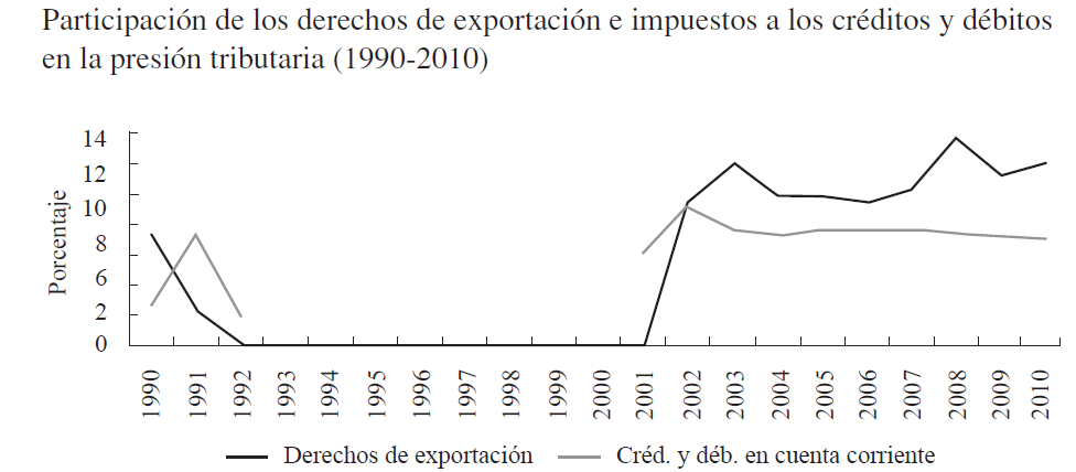 Tras el abandono de la convertibilidad, durante un período traumático para los argentinos, los posteriores gobiernos, es decir el de Néstor Kirchner (2003-2007) y los de Cristina Fernández (desde 2007), se beneficiaron de la devaluación que les significó una nueva fuente tributaria. Asimismo, las condiciones económicas y sociales, en general, mejoraron ostensiblemente durante la segunda mitad de la primera década de este siglo. Lo que permitió atender la crisis internacional de 2008 sin mayores presiones del lado tributario; el superávit fiscal se había consolidado desde 2003 y la deuda externa se había reducido, lo cual implicó un menor costo de su servicio.