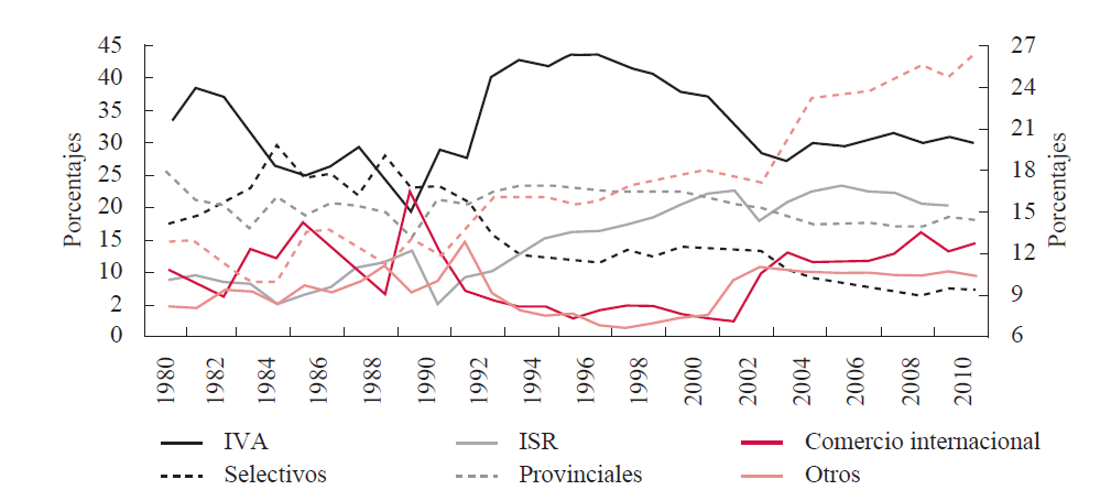 Así, en la primera década del siglo XXI se incrementaron además otros impuestos no tradicionales (también llamados heterodoxos), que al no ser en un inicio coparticipados con las provincias (Dborkin y Feldman, 2008) resultaban especialmente redituables para el gobierno federal. Por otro lado, desde finales de los años noventa se han registrado pocas modificaciones relevantes de los impuestos tradicionales, porque las condiciones económicas hasta 2011 no lo han requerido; los aumentos del IVA son menos probables, pues este impuesto se encuentra relativamente generalizado y su tarifa es alta10; y el interés de incentivar la inversión limita el conjunto de opciones en lo referente a los ISR.