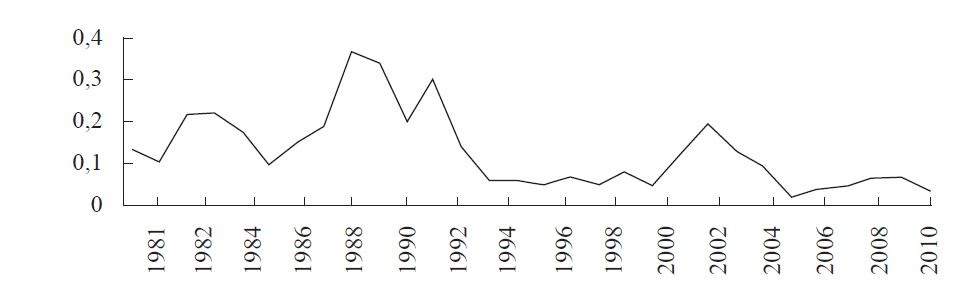 Para plantear de manera resumida la dependencia de las reformas tributarias del contexto económico, se procede a clasificar las recesiones en la historia reciente argentina según su profundidad y duración13 (véanse Fanelli y Albrieu, 2012). El orden de estas crisis, según la Gráfica 4, de la más grave a la más leve es convertibilidad, hiperinflación (1989), deuda externa, hiperinflación (1985) y efecto tequila, las cuales guardan una estrecha relación con la variabilidad tributaria expresada por el índice de Ashworth y Heyndels (AH) (2002)14, cuya evolución se presenta en la Gráfica 5. Es interesante que los períodos de mayor cambio porcentual del índice AH hayan sido 2000-2002 (314%) y 1986-1989 (267%), que coinciden con las dos recesiones más importantes.