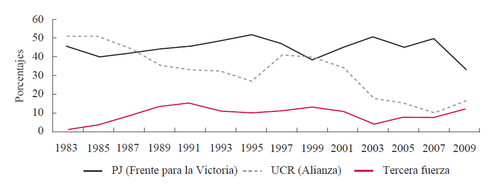 Notas: el PJ en 2005 se dividió en el Frente para la Victoria y la corriente Peronista Federal y se tomó las curules del primero para completar la serie hasta 2009. Se usó el genérico “tercera fuerza” para hacer referencia al partido o coalición diferente al PJ y el UCR con el mayor número de escaños en la Cámara.