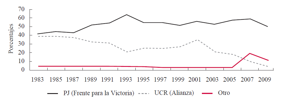 Nota: se usó el genérico “otro” en lugar de tercera fuerza porque desde 2007 la UCR perdió su posición de segunda mayoría, la cual fue ocupada primero por la corriente Peronista Federal y desde 2009 por el Interbloque Federal.