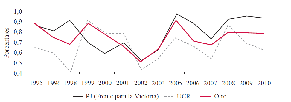 Notas: para cada año se tomó el promedio de los índices calculados con base en las votaciones sobre legislación tributaria; en 1997 y 2004 no hubo información en la materia para construirlos. La curva denominada “otro” toma el índice correspondiente a cada uno de los siguientes partidos para el año o período indicado entre paréntesis: Unión del Centro Democrático (1995), Frepaso (1996-2004), ARI (2005-2007) y la Coalición Cívica (2008-2010).