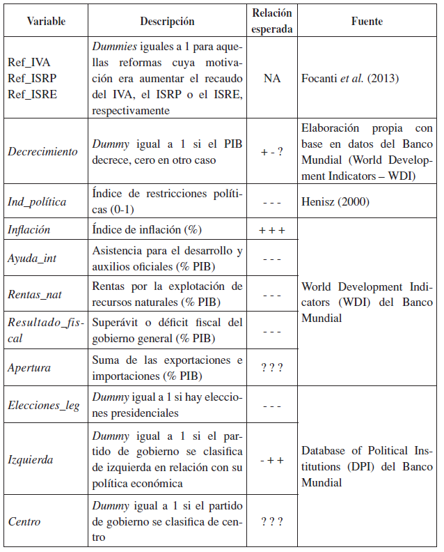 Es decir, que se opta por un panel de datos anual con un total de 292 observaciones; se consideran tres variables endógenas que corresponden a las reformas del IVA, el ISRP y el ISRE con interés recaudatorio. Si bien la base de datos construida por Focanti et al. (2013) es más comprensiva, pues incluye modificaciones a los aportes sociales y beneficios tributarios; por ejemplo, se decidió abordar solo los tres impuestos ya comentados porque son aquellos en que se concentró el estudio de caso de esta investigación.