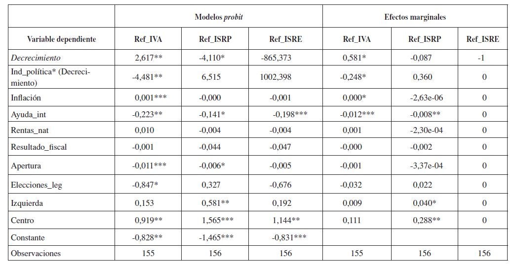 Por otro lado, para capturar la incidencia de las crisis económicas y las condiciones en que se encontraron los gobiernos para aprobar sus iniciativas, en particular de índole tributaria, se incluyeron dos variables: la primera se refiere a una dummy llamada Decrecimiento igual a 1 cuando el PIB de un país cae en valor real; la otra es el índice de restricciones políticas (Ind_política) elaborado por Henisz (2000). Sin embargo, para efectos del ejercicio se tomó la interacción entre este índice y el Decrecimiento; en otros términos, se consideró que un Gobierno no está continuamente reformando el sistema tributario y solo lo hace en determinados momentos, en especial durante las crisis, y es entonces cuando su poder político es fundamental.
