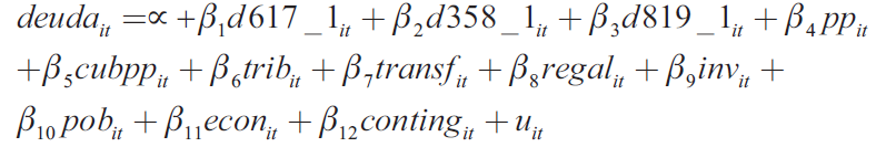La especificación funcional del modelo econométrico propuesto es la siguiente, donde i representa la unidad de corte transversal —gobernación o alcaldía—, y t la unidad temporal anual: