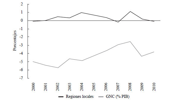 En los últimos años, los aspectos regionales han desempeñado un rol cada vez más relevante en el contexto nacional. Su dinámica tiene una estrecha relación con una función de bienestar social, pues refleja un grado importante de operatividad para brindar bienes y servicios públicos localizados y, por esa vía, lograr atender necesidades específicas de grupos de población diversos y heterogéneos. Adicionalmente, desde hace algún tiempo sus resultados fiscales han logrado compensar una parte del déficit fiscal del sector público consolidado, en especial del registrado por el gobierno nacional central. En promedio, este último obtuvo gastos superiores a sus ingresos en 4,3% del PIB entre los años 2000 y 2010, mientras que el sector regionales y locales1 evidenció un superávit fiscal de 0,3% del PIB en el mismo período (Gráfica 1).