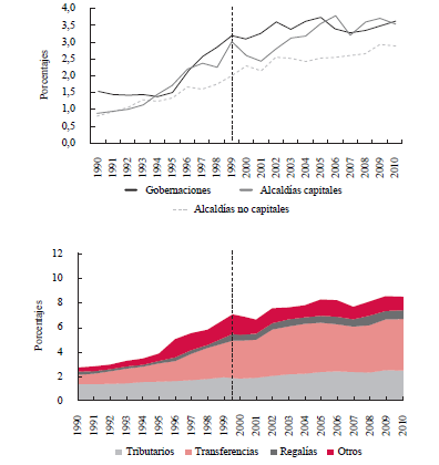 Tamaño de los ingresos tributarios con respecto a los ingresos totales de las gobernaciones y alcaldías. Captura la incidencia del esfuerzo fiscal de gobernaciones o alcaldías para la generación de recursos propios. A mayor recaudo tributario, se espera un incremento del ahorro en la entidad territorial, por lo que los planes de inversión no requieren obligatoriamente de apalancamiento financiero pues existe un margen de liquidez. Cuando los ingresos por concepto de impuestos territoriales disminuyen, el ahorro cae y los planes de inversión pueden ocasionar aumentos sucesivos del stock de la deuda (Rodden, 2002, citado por Braun y Llach, 2010).