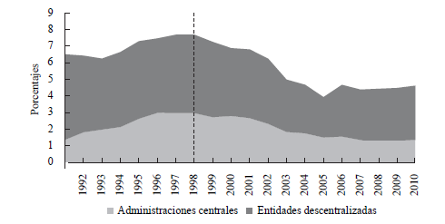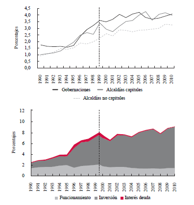 En la década de los noventa, los gastos de las entidades territoriales crecieron 6,4% del PIB, al pasar de 2,9% del PIB en 1990 a 9,3% en 1999. Para la década siguiente, el aumento de los gastos totales fue conservador, observándose un incremento de los mismos de tan solo 2,2% del PIB, para terminar al cierre de la vigencia 2010 en 10,7% del PIB (Gráfica 3).