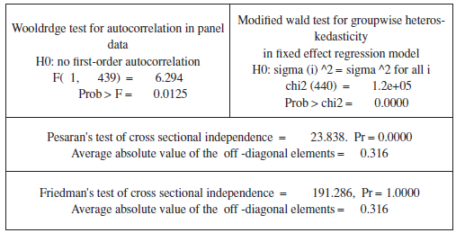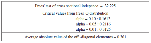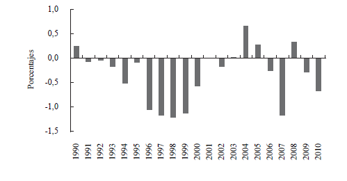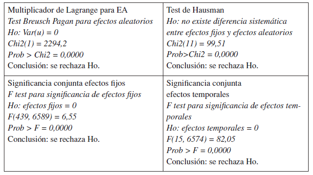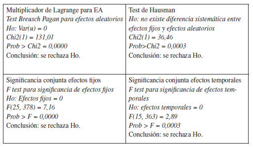 Inicialmente, a través de la prueba de multiplicador de Lagrange para efectos aleatorios (EA), se encontró que para un nivel de significancia del 5% se rechaza la hipótesis nula de que la varianza de la heterogeneidad no observada es igual a cero (Tablas 4 y 5), por lo que se prefiere a EA; pues la estimación por mínimos cuadrados ordinarios agrupados resultaría no consistente por el problema de variables omitidas. Posteriormente, para verificar si existe o no correlación entre los efectos no observados y las variables explicativas incorporadas en la estimación, se realizó el test de Hausman, que para un nivel de significancia del 5% rechaza la hipótesis nula de que no existe una diferencia sistemática entre efectos fijos (EF) y EA (Tablas 4 y 5), por lo que se prefiere EF, pues una estimación por EA resultaría sesgada y violaría el supuesto de exogeneidad estricta39. Adicionalmente, dadas las pruebas estadísticas de significancia conjunta (Tablas 4 y 5), se incluyeron en las estimaciones efectos de tipo temporal, que aunque cambian en el tiempo, afectan por igual a las distintas unidades de corte transversal (Durán, 2009; Wooldridge, 2002, 2006).