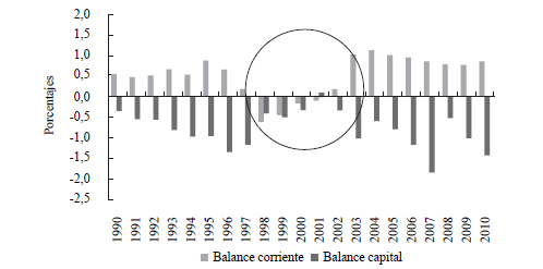 El anterior escenario se explica fundamentalmente por la tendencia decreciente del ahorro corriente en la década de los noventa, que llegó a ser negativo entre 1998 y 2001, dados los incrementos experimentados en los gastos de funcionamiento, muy por encima del aumento en los recursos de recaudo propio; tendencia que paulatinamente se revirtió con la generación de superávits corrientes que lograron compensar los déficits de capital (Gráfica 5).