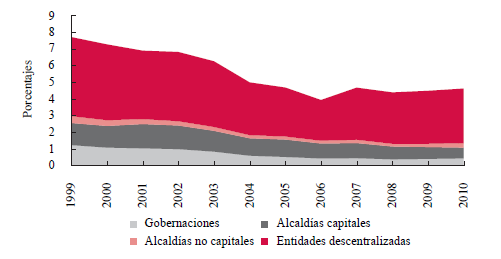 En contraste, entre 2000 y 2010 la deuda pública territorial experimentó una reducción de 3,1% del PIB, ubicándose en 4,6% del PIB al cierre de 2010 (Gráfica 6). En el mismo período, el endeudamiento de las alcaldías capitales se redujo en 0,7% del PIB, seguido de las gobernaciones (0,6%) y alcaldías no capitales (0,1% del PIB) (Gráfico 7). Sin embargo, el sector descentralizado se ha