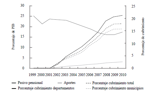 Entre 1999 y 2010, el pasivo pensional pasó de representar el 25% del PIB al 17%. En el mismo período, los esfuerzos realizados por las entidades territoriales para cubrir el pasivo pensional se han hecho evidentes: para 2010, los aportes en el Fondo Nacional de Pensiones de las Entidades Territoriales (Fonpet) fueron equivalentes al 3% del PIB, lo que se tradujo en un porcentaje de cubrimiento20 del 18% (Gráfica 8).