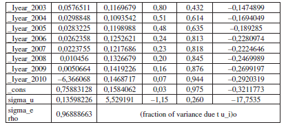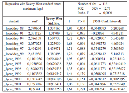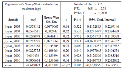 Por su parte, los efectos temporales tienen en cuenta las condiciones macroeconómicas que afectan por igual a las entidades territoriales y que cambian en el tiempo. En este caso, capturan factores como el PIB nacional, el tipo de cambio, las tasas de interés, entre otros. Adicionalmente, recogen buena parte de la esfera política desarrollada en la metodología de Braun y Llach (2010), pues incorporan en la estimación la evolución temporal del stock de deuda, que está fuertemente vinculada al ciclo político presupuestal. Esto es, en la medida que se acerca el fin de período de los mandatarios territoriales, la ejecución de la inversión tiende a acelerarse (para que las preferencias electorales se mantengan en el futuro), así como el endeudamiento. De esta forma, a diferencia de Sánchez y Zenteno (2010), si bien no se explicitaron variables de tipo político en la estimación, estas fueron capturadas a través de las variables dummy para cada uno de los años de análisis que, como se mencionó, resultaron estadísticamente significativas.