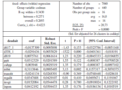 De esta forma, para una muestra conformada por 26 gobernaciones y un grupo de 440 alcaldías para el período comprendido entre 1995 y 2010, se encontró evidencia estadística para realizar la estimación a través de la metodología denominada efectos fijos (transformación within), incluyendo efectos temporales.